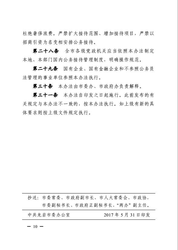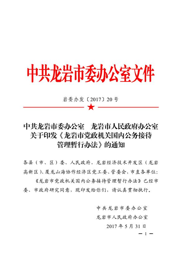 市委辦、市政府辦關于印發(fā)《龍巖市黨政機關國內公務接待管理暫行辦法》的通知(巖委辦發(fā)【2017】20號)