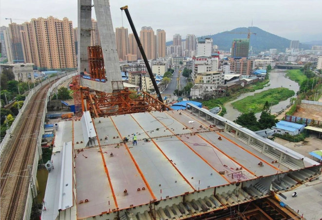 大橋鋼箱梁工程還有19片箱梁,鋼箱梁總長340米,每片質(zhì)量平均290噸,計劃8月初全部完成吊裝。與此同時,主塔第一次轉(zhuǎn)體計劃于4月中旬實施,第二次轉(zhuǎn)體計劃在8月底,確保年底大橋通車。